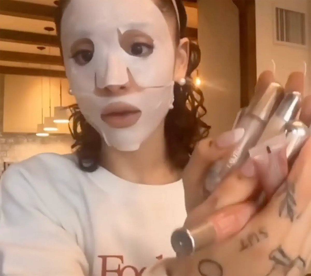 For fans who have spent years watching Grande perform in full glam, seeing her with a sheet mask, a headband, and a pile of lip glosses on her lap felt like a proper glimpse behind the curtain. Curls and all.