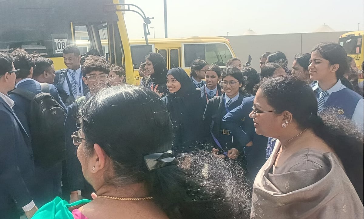 A joyful atmosphere as the principal and teachers welcomed relieved students at Bhavan’s Pearl Wisdom School, Dubai.