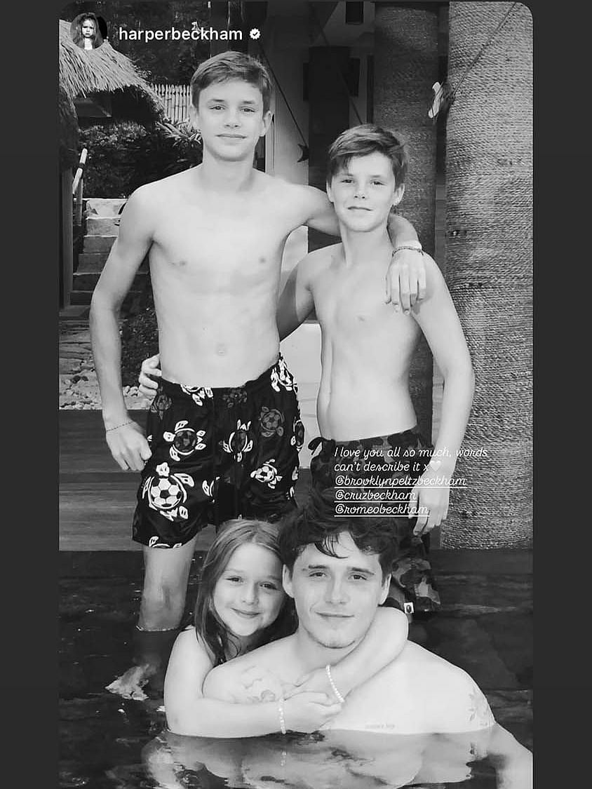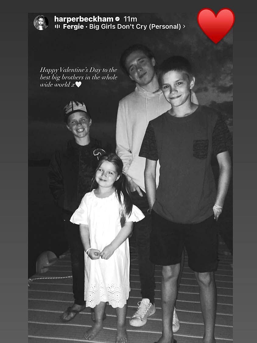 On Saturday February 14, Harper took to her private Instagram Stories to share an emotional tribute to her three older brothers, Brooklyn, Romeo and Cruz Beckham. The post featured a black and white throwback photograph of the four siblings together, with Harper smiling broadly and her arms wrapped around Brooklyn in a swimming pool whilst Romeo and Cruz stood behind them with their arms around each other.