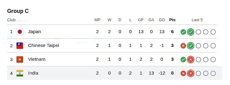After the defeat, India remain at the bottom of the Group C table with no points from two matches. Japan lead the group with six points, while Vietnam and Chinese Taipei both have three points.