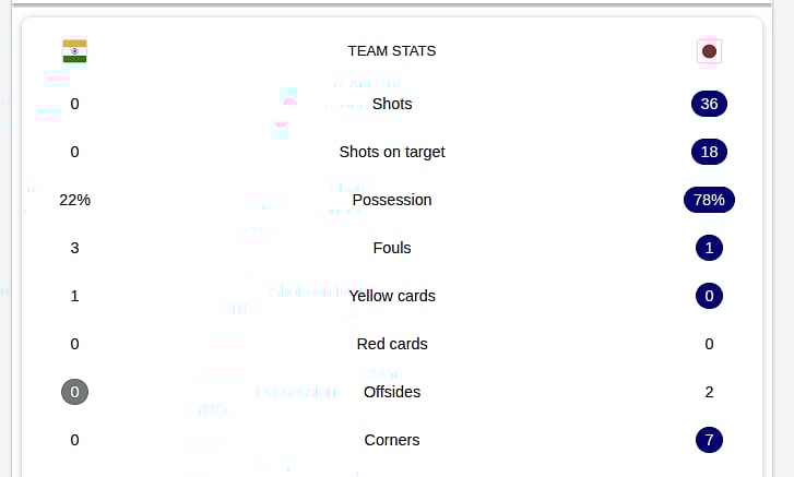 Japan continued their dominance in the second half and added more goals to complete an 11-0 victory. India failed to register a single attempt throughout the match, while Japan produced 36 shots, 18 of them on target, and enjoyed 78% possession. The statistics clearly reflected the huge gap in quality between the two sides.