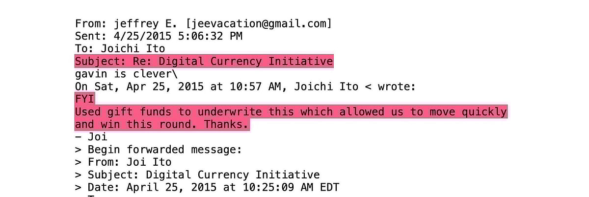 Emails released by the House Committee show Epstein’s “gift funds” were used to underwrite the initiative’s launch. In one April 2015 message titled “Digital Currency Initiative,” Ito thanked Epstein, writing that the funding allowed the lab to “move quickly and win this round.”