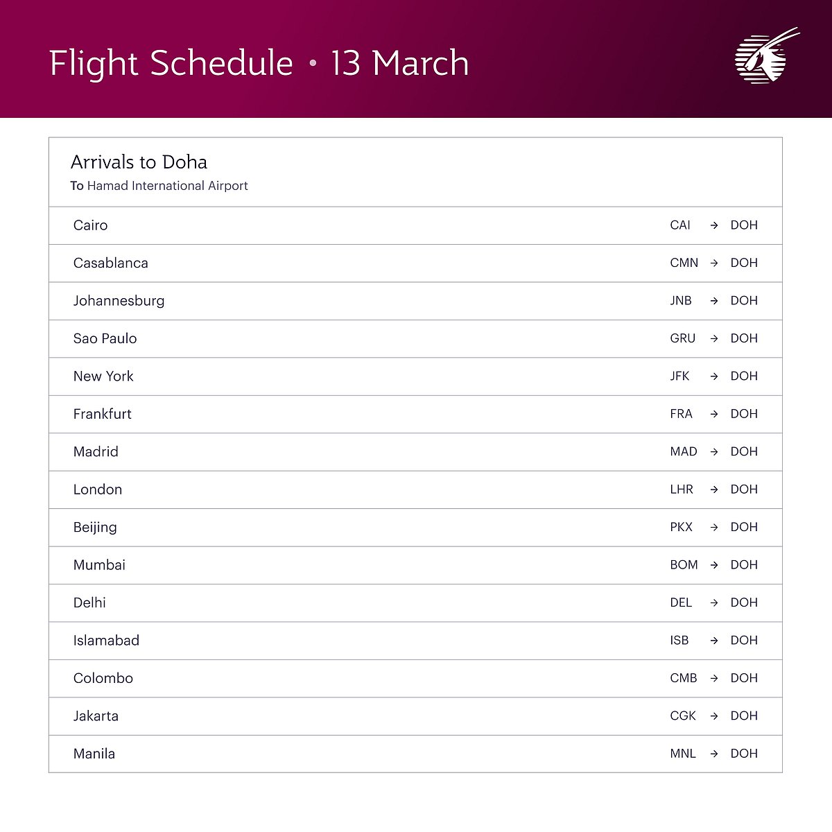 Bookings and updates: Visit the Qatar Airways website, mobile app, or contact your travel agent.