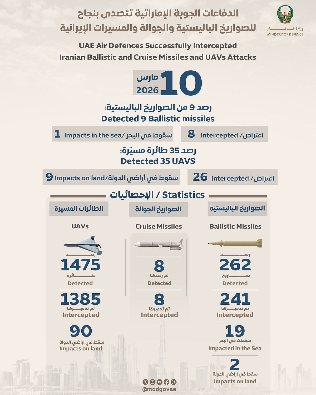 Abu Dhabi: The UAE’s air defence systems on 10 March 2026 dealt with multiple ballistic missiles and drones, according to figures released by the Ministry of Defence.