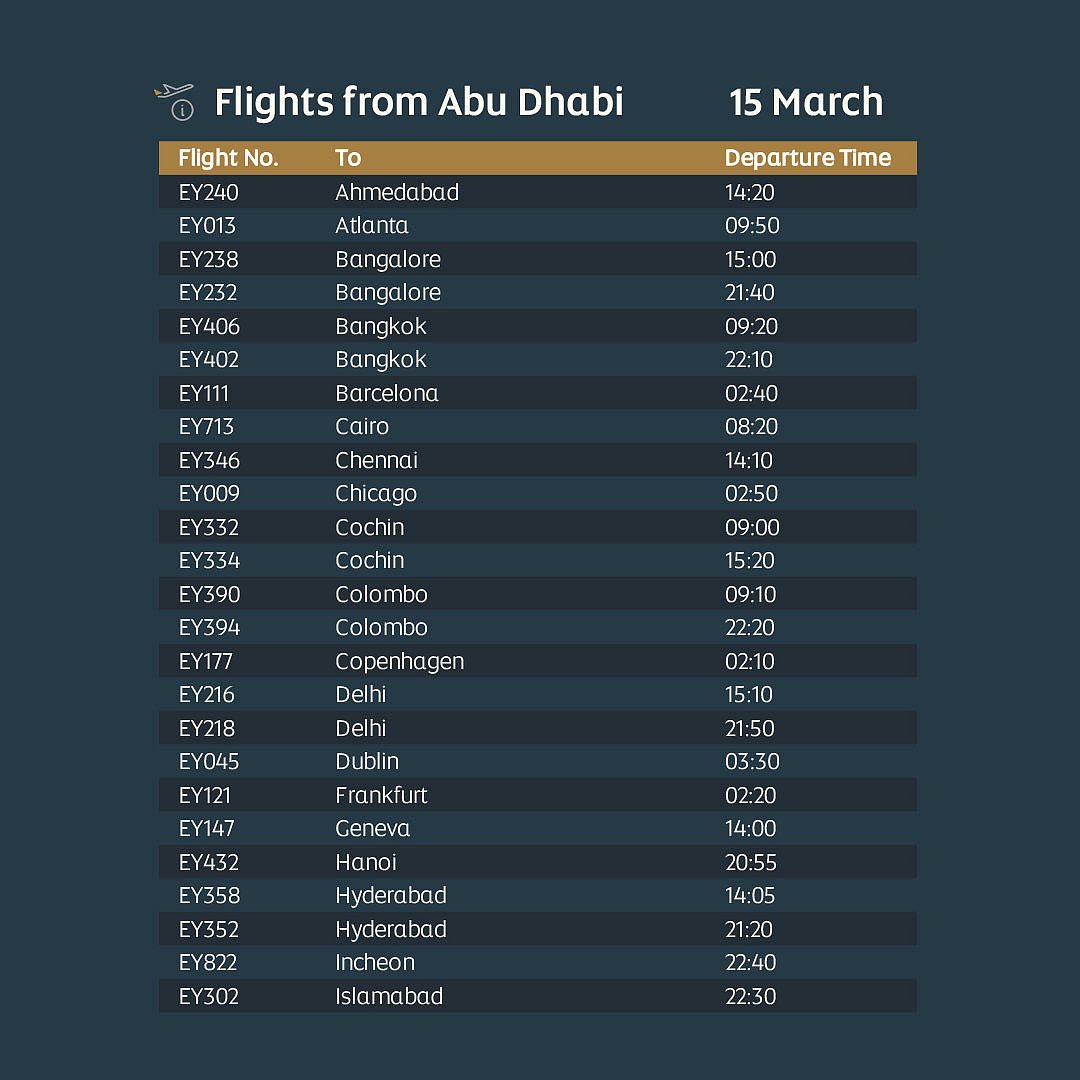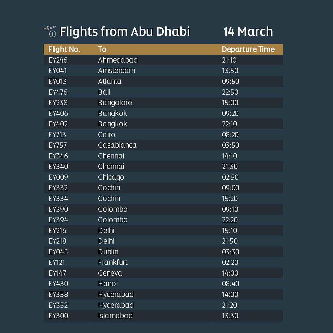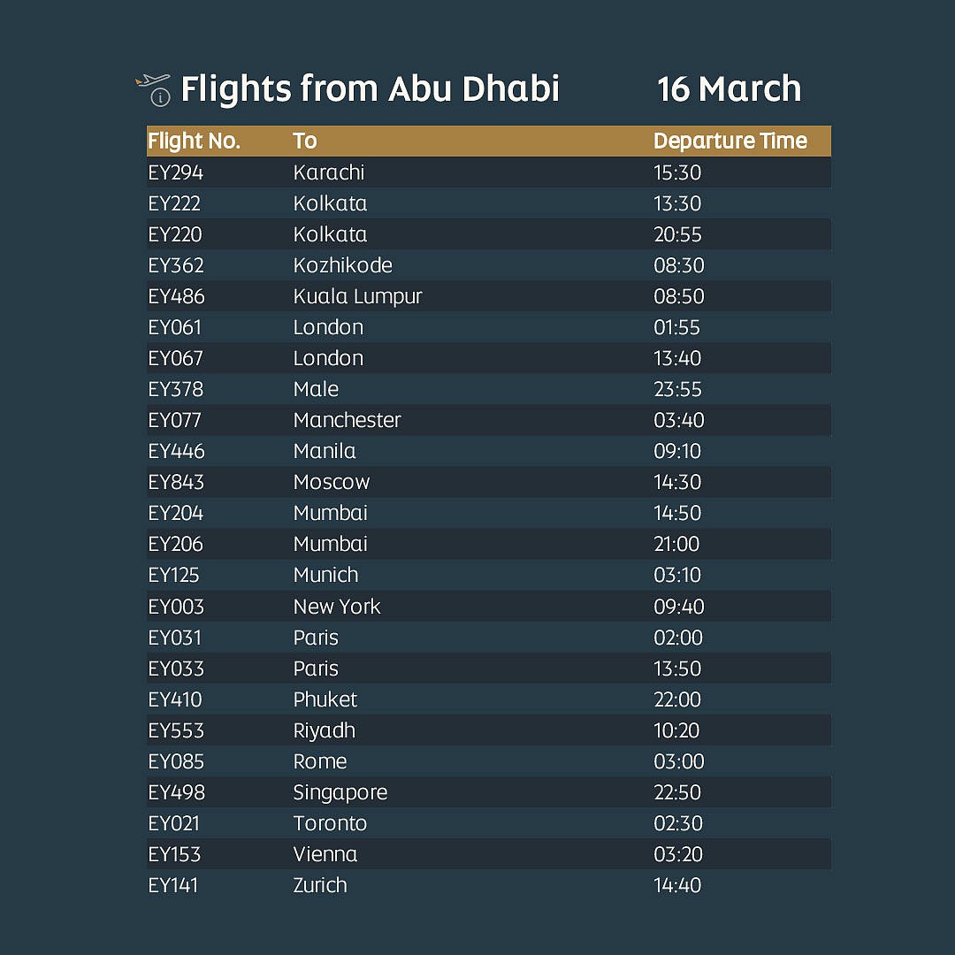 Etihad has updated its limited flight schedule until March 16, serving key international destinations. Passengers should not travel to Abu Dhabi airport unless contacted directly or holding confirmed bookings.
