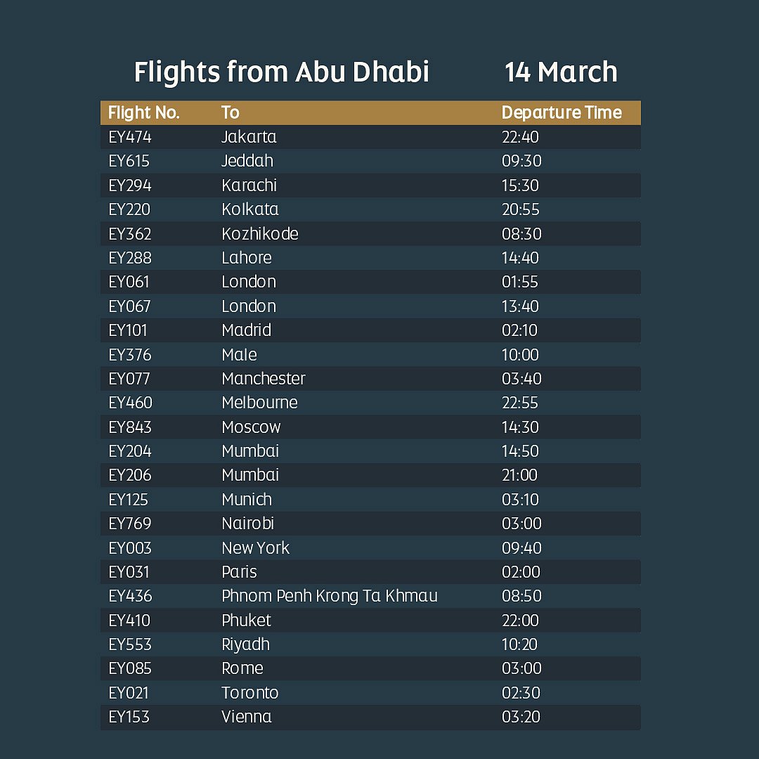 Etihad has updated its limited flight schedule until March 16, serving key international destinations. Passengers should not travel to Abu Dhabi airport unless contacted directly or holding confirmed bookings.